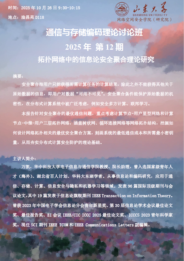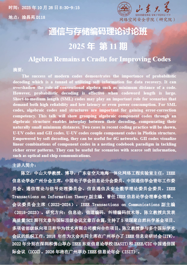 下一条:【通信与存储编码理论讨论班】《格理论、算法及应用》《Decomposition and Combination: Way to Near-Optimal》《Information Theoretical Analyses of Outlier Hypothesis Testing》