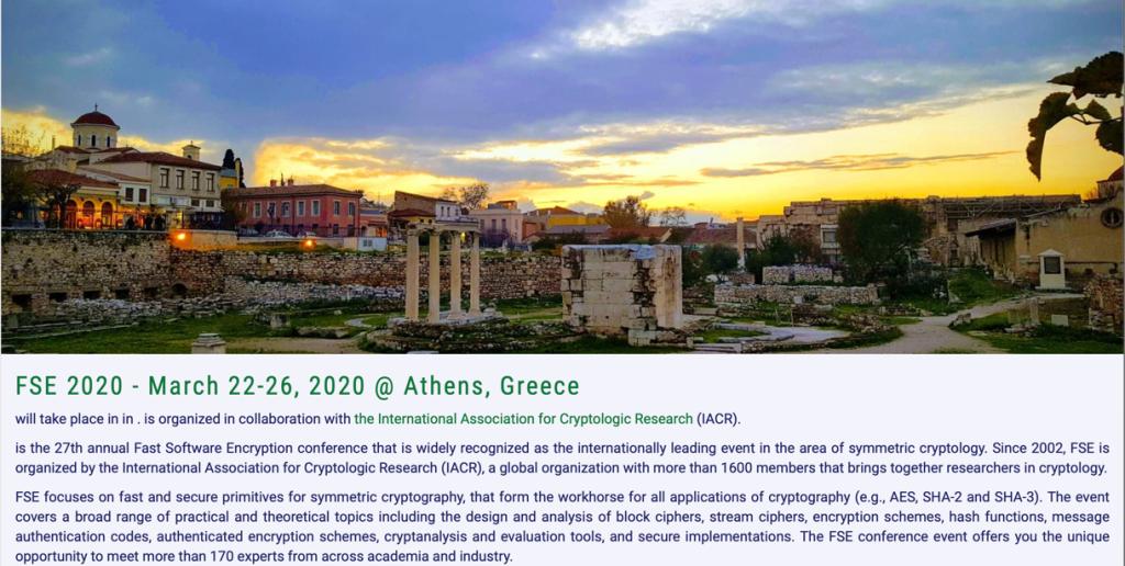 FSE是国际密码协会(IACR)的旗舰会议之一,是对称密码领域的顶级会议(is widely recognized as the internationally leading event in the area of symmetric cryptology)。FSE 2020将于3月22日至26日在希腊召开。