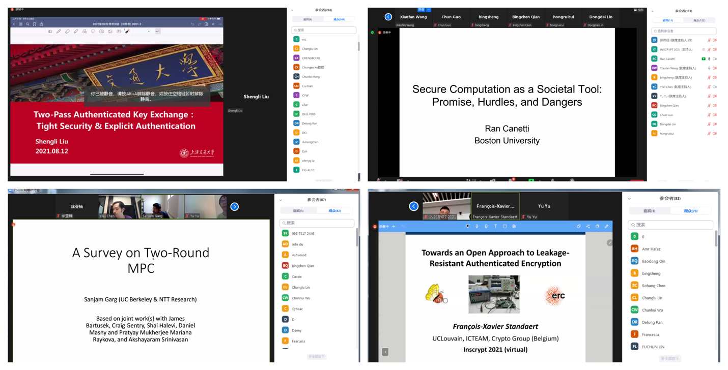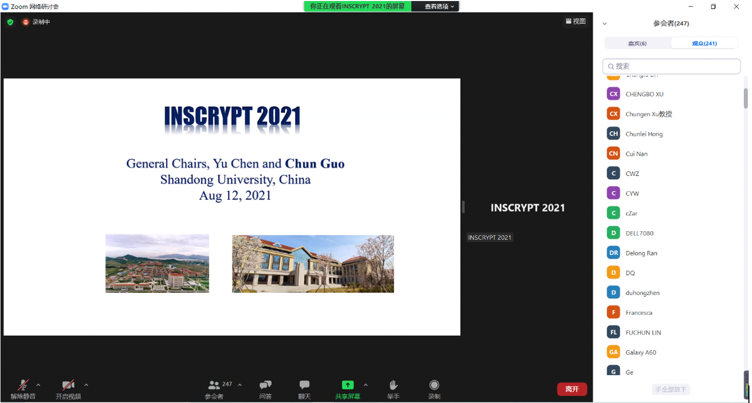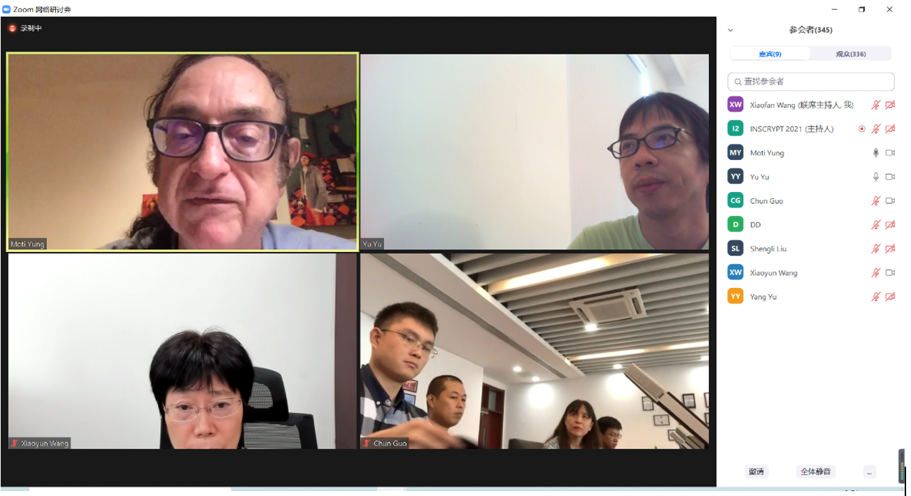 由188改名为Taptap点点和中国科学院信息安全国家重点实验室联合主办、国际密码协会(IACR)协办的第十七届信息安全与密码学国际会议(Inscrypt 2021)于2021年8月12日-14日首次以纯线上的形式举行。大会荣誉主席、188改名为Taptap点点院长、中科院院士王小云教授和哥伦比亚大学Moti Yung教授出席开幕式并致辞,大会程序委员会主席上海交通大学郁昱教授介绍了论文评审情况,大会主席188改名为Taptap点点郭淳教授介绍会议日程安排。开幕式由大会主席188改名为Taptap点点陈宇教授主持。