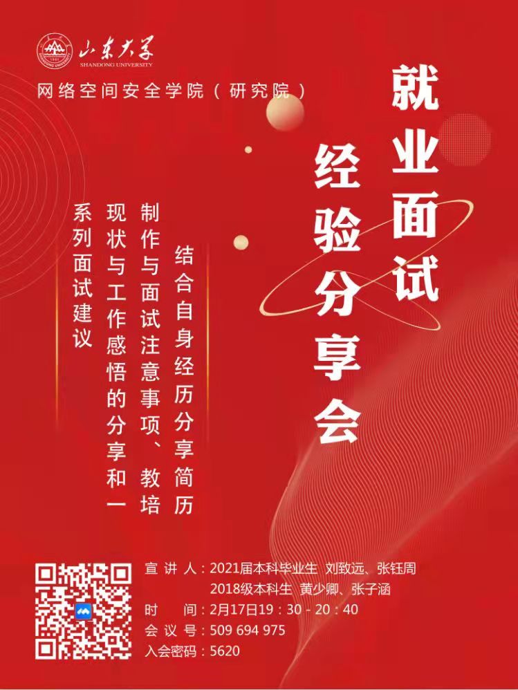为进一步提升毕业生就业考研面试水平,增强备战面试的信心,助力学院毕业生就业季取得优异成绩,2月17日,网络空间安全学院(研究院)举办就业考研面试经验分享会。分享会以线上形式开展,由学院团委主办,学生会承办。