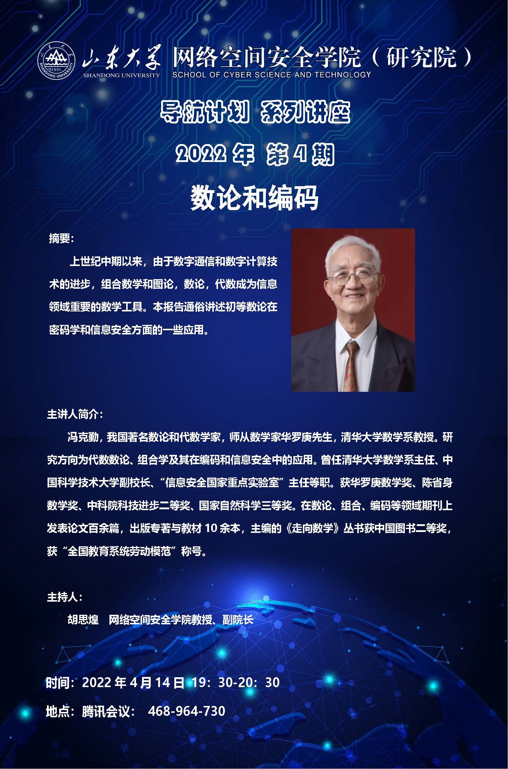 4月14日,网络空间安全学院(研究院)邀请我国著名数论和代数学家,清华大学数学系教授冯克勤,做客学院“导航计划”系列讲座,做题为“数论和编码”学术报告。学院副院长胡思煌主持报告会。