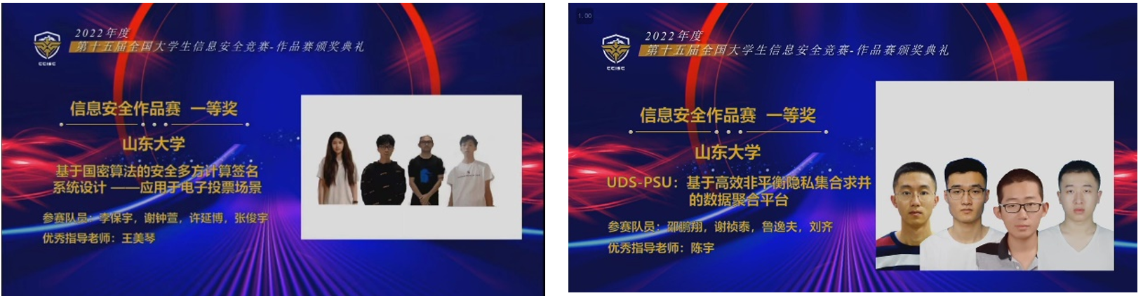 经过激烈角逐,我院由王美琴教授指导的“基于国密算法的安全多方计算签名系统设计——应用于电子投票场景”,设计实现了一种基于国密算法的安全多方计算签名方案,并将其应用于电子投票场景中,保证了电子投票系统的合法性、唯一性、隐私性、公正性、完整性、准确性以及可验证性的要求,并通过协议设计实现了投票过程抗量子攻击特性。由陈宇教授指导的“UDS-PSU:基于高效非平衡隐私集合求并的数据聚合平台”,设计了非平衡隐私集合求并协议(unbalanced Private Set Union, UPSU),这是首个半诚实模型下安全的两方非平衡PSU协议。平台UDS-PSU可应用于任意具有隐私保护需求的数据聚合场景,例如电子政务、智慧医疗、金融建模等领域,具有广阔的应用前景。两项作品凭借优秀的方案设计及出色的答辩获得一等奖。由魏普文教授指导的“隐私计算防护系统V-LDP”,提出了针对隐私计算攻击的防御机制V-LDP,通过在本地化差分隐私LDP中有效嵌入零知识证明协议来保障本地化差分隐私的计算正确性。其证明生成速度较同类最优方案提高了一倍以上,在保护数据提供者隐私的同时,保证了数据收集者所收集数据的质量以及数据反馈实效,最大化数据提供者的安全性和数据收集者的效益,该作品获得二等奖。由庄金成教授、张国艳副教授分别指导的“Ark——基于新型格困难问题的抗量子攻击的密码系统”、“ZCAGE-基于PLONK零知识证明协议与区块链的风险评估平台”2项作品获得三等奖。