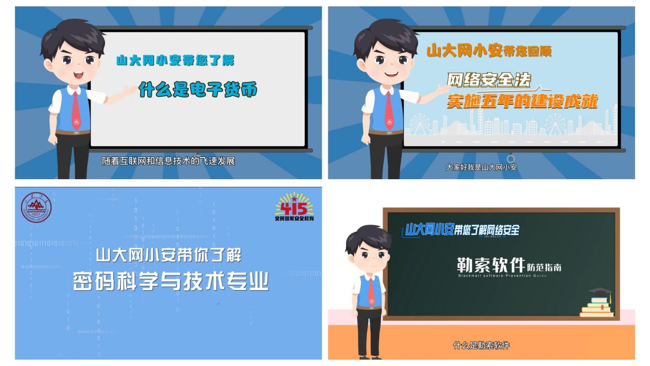 以“山大网小安”为主要角色,网安学院师生已创作完成“网小安教你如何防范勒索软件”“网小安带你回顾网安法实施五年”“网小安带您了解个人信息保护法”“网小安带您了解健康码中的网络安全”等动漫、图文科普作品20余部,部分作品被中央网信办采纳并在光明网推广,取得了很好的科普宣传效果。创作团队将根据示范工程项目要求,继续做好“山大网小安”科普动漫作品创作,组织师生力量编写面向青少年的网络安全科普读物,为网络安全知识普及贡献力量。