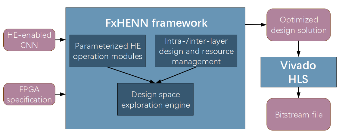 全同态加密技术(Fully Homomorphic Encryption, FHE)是一种当前备受瞩目的隐私计算技术,能够对加密的数据进行计算,然而它通常会导致5-6个数量级计算和存储开销的增加,这使得基于FPGA等硬件进行优化加速成为了必要趋势。本论文分析了基于全同态加密技术保护的神经网络推理过程(HE-CNN)的性能瓶颈,采用FPGA高层次综合技术对其进行了参数化设计优化以及资源和性能建模。通过进行自动化设计空间探索,对给定嵌入式FPGA开发板上确定最优化资源配置并生成加速器硬件电路。本文是第一个在基于商用低功耗FPGA的嵌入式/边缘计算平台上实现全栈式部署的非交互HE-CNN加速框架,和目前最先进的CPU方案相比能效比提升1178.12倍,其结果证明了在嵌入式FPGA上部署HE-CNN的可行性。