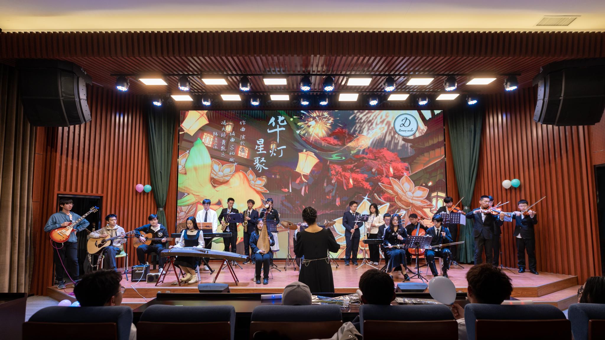 晚会还穿插了自由展示环节和互动游戏,同学们积极参与,现场气氛欢快活泼。最后,在DS器乐社的器乐合奏《华灯星聚》中,晚会画上句号。