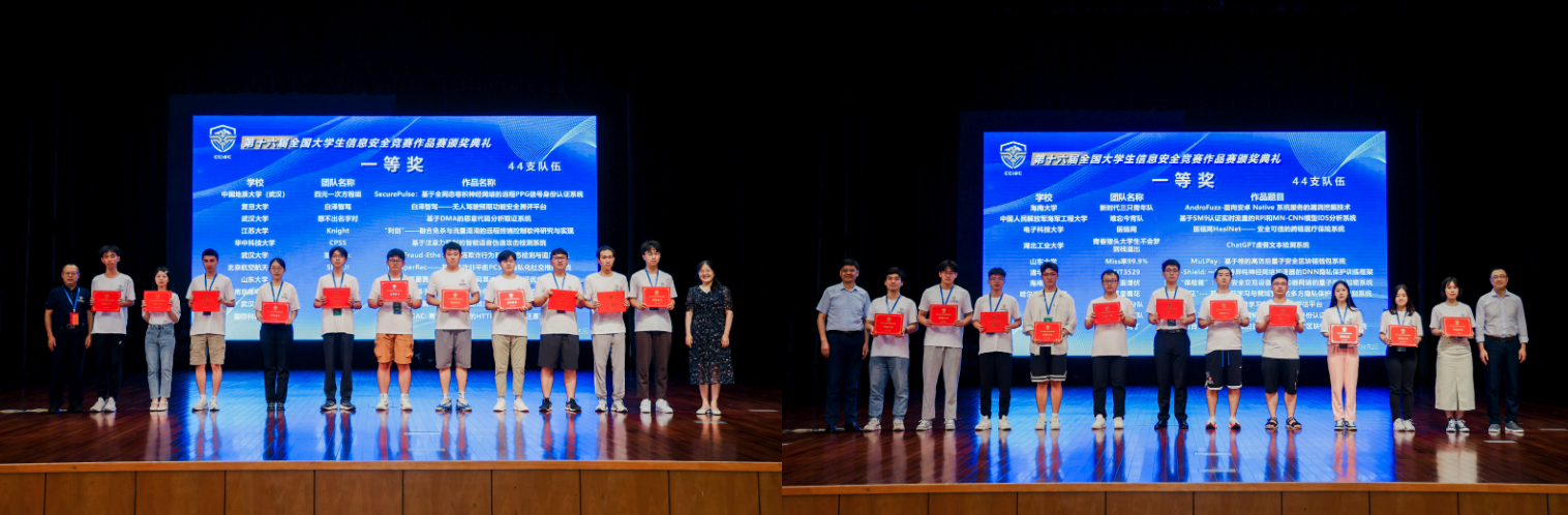 本届比赛由教育部高等学校网络空间安全专业教学指导委员会主办,浙江大学、杭州电子科技大学承办。初赛入围作品达774项。经过激烈角逐,全国共评选出一等奖44项、二等奖66项、三等奖88项。其中,由魏普文教授指导的“量子蔷薇:基于后量子密码算法的固件认证优化方案”作品(队长:赵翔正,队员:马洋、倪佳蔚、张浩旸)和由庄金成教授指导的“MuLPay: 基于格的高效后量子安全区块链钱包系统”作品(队长:吴兵,队员:张雨欣、欧阳仁鼎、高培民)获一等奖;由魏普文教授指导的“基于后量子隐私增强保护的电动汽车充电认证方案”作品(队长:刘晨曦,队员:刘家铭、陈辉华、卢梓宁)获二等奖;由陈宇教授指导的“后量子时代的PGP”作品(队长:王雯丽,队员:王子瑞、李昕、刘舒畅)和由李增鹏副研究员指导的“LocAnon: 隐私感知近邻检索与距离计算平台”作品(队长:韦肖扬,队员:李卓群、李博睿、仇召昱)获三等奖。