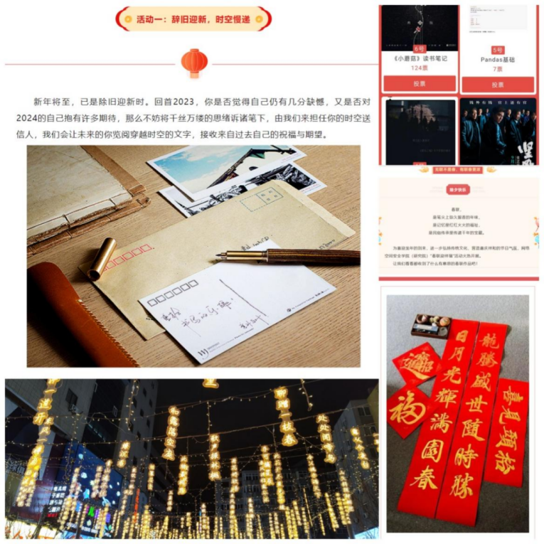 美育润心,特色活动丰富学生寒假生活:寒假期间,学院依托各类学生组织和学生社团,开展“活力满满,欣欣向‘龙’”主题征文活动、“辞旧迎新、时空慢递”、“传统中国年”等新年主题特色活动。学院学生积极参与,通过线上写春联、猜灯谜、拍摄短视频等形式分享新春祝福;借助“网小安”公众号“时·节”栏目,同学们记录包饺子、赶庙会、年夜饭,展示各地不同的春节习俗,通过撰写游记、学习笔记、影评等方式分享寒假学习生活经历体验。