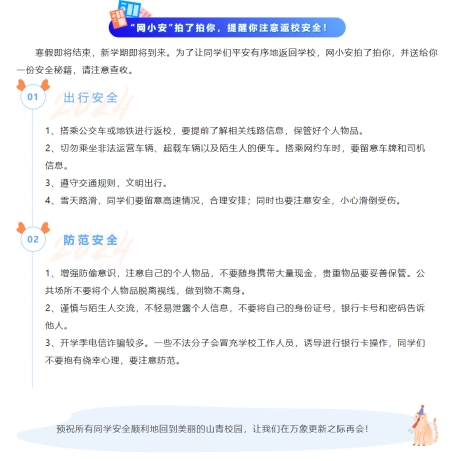 网络空间安全学院贯彻落实学校和校区寒假工作要求,坚持以学生为中心,统筹谋划,全面落实,从学生安全、社会实践、帮扶指导等多个方面开展好寒假学生教育管理服务工作。