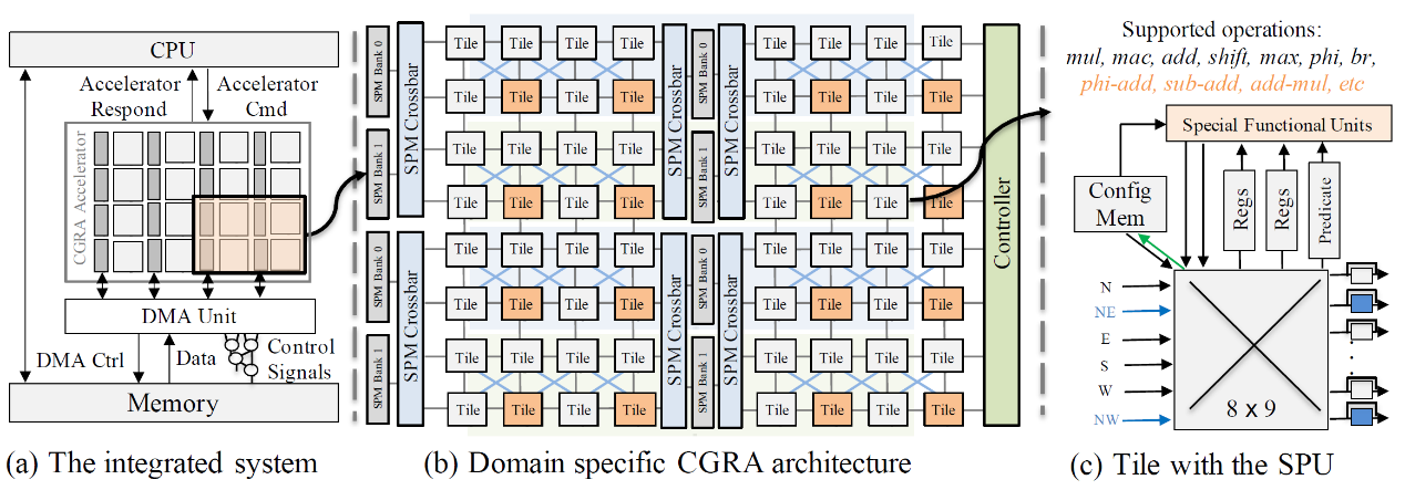研究成果“FHE-CGRA: Enable Efficient Acceleration of Fully Homomorphic Encryption on CGRAs”的第一作者是网络空间安全学院2023级硕士研究生蒋淼淼,通讯作者为鞠雷教授,论文的合作者来自谷歌、蚂蚁集团、新加坡国立大学以及泉城省实验室。全同态加密技术(FHE)允许在不解密的情况下直接对密文进行计算,是最具广阔应用前景的隐私保护技术之一。支持 FHE 的神经网络应用程序在不同网络层通常具有不同的FHE密文变体(如不同乘法深度的密文),带来了对硬件资源利用的不同瓶颈及其设计需求。本文针对此特性,利用粗粒度可重构架构(CGRA)的运行时可重构性,基于MLIR编译器具链提出了一套端到端同态应用的硬件加速框架FHE-CGRA。实验结果表明FHE-CGRA 与当前最优的基于 FPGA 的 FHE-CNN加速器相对,在加速FHE-CNN应用时的能效比提升16.48倍。