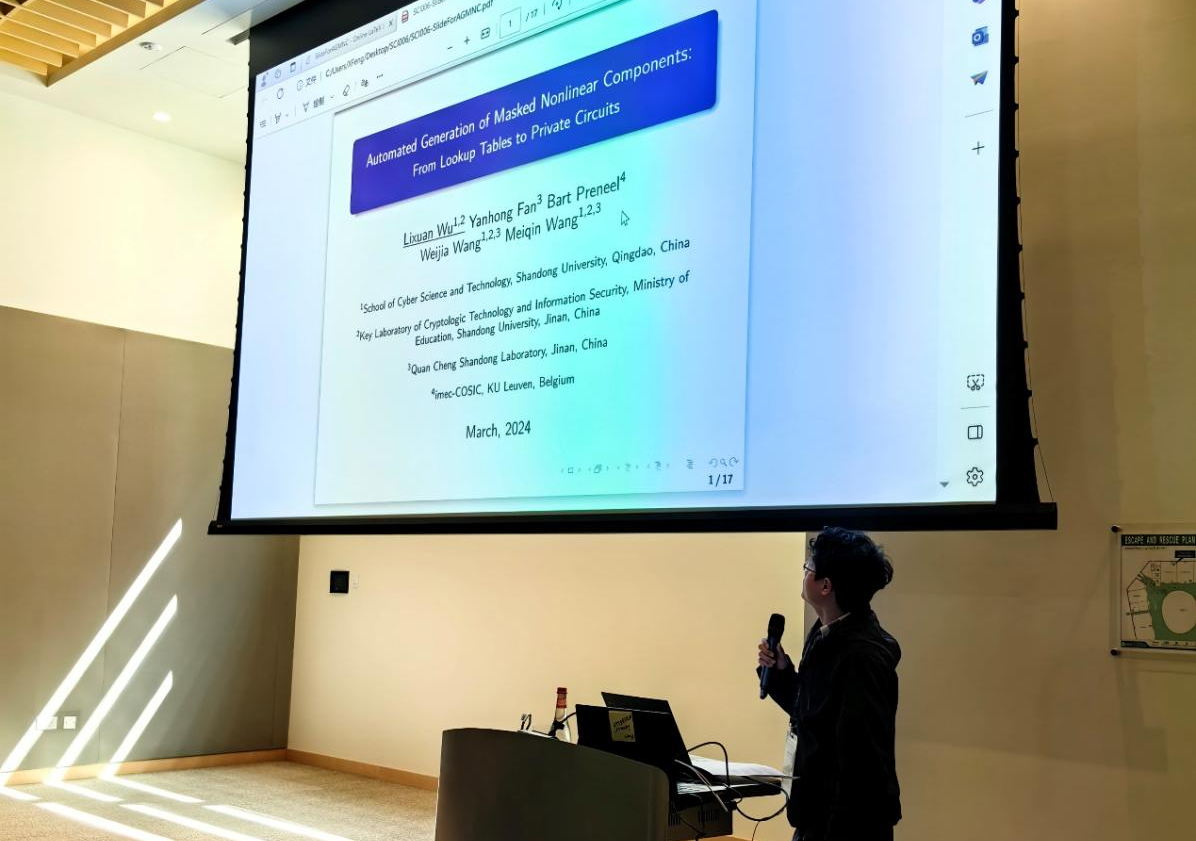 博士研究生吴立轩作了题为“Automated Generation of Masked Nonlinear Components: From Lookup Tables to Private Circuits”的报告,该报告介绍了如何通过研发的自动化工具AGMNC生成具备优秀硬件性能的掩码方案。硕士研究生赵正作了题为“Construction of 4×4 Lightweight Low-latency Involutory MDS Matrices”的报告,该报告聚焦于低延迟场景下构造轻量级对合MDS矩阵的方法,并得到了学界成本最低的对合MDS矩阵。硕士研究生林韵雪作了题为“Related-Tweak and Related-Key Differential Attacks on HALFLOOP-48”的报告,通过自动化搜索方法,给出了可调分组密码HALFLOOP-48公开的非通用密码分析。