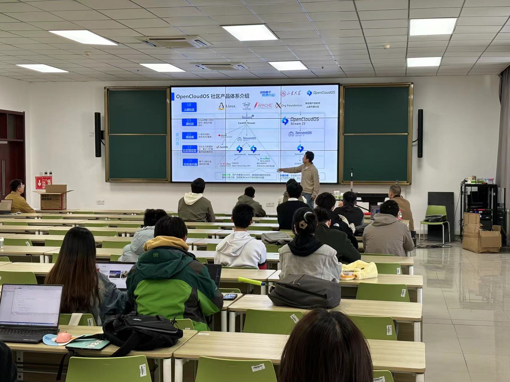 OpenCloudOS Kernel SIG Maintainer、腾讯高级工程师邢万里结合社区发展历史和前沿进展,以“OpenCloudOS 云原生数字时代开源操作系统的发展与实践”为题,介绍了OpenCloudOS服务器开源操作系统、社区生态发展现状和未来技术规划,并以自身学习过程为例,分享了在开源操作系统领域的相关学习经验。OpenCloudOS AI SIG Maintainer、腾讯高级工程师赵振进行了OpenCloudOS AI生态软件栈支持任务宣讲,他指出在AI时代OpenCloudOS面临的诸多挑战,鼓励同学们积极参与开源实践项目,共同推动开源社区的发展。随后,开放原子开源基金会开源大赛组委会办公室高级运营官郭顺德介绍了开放原子开源大赛相关赛题及参与方式,鼓励同学们积极报名参赛。