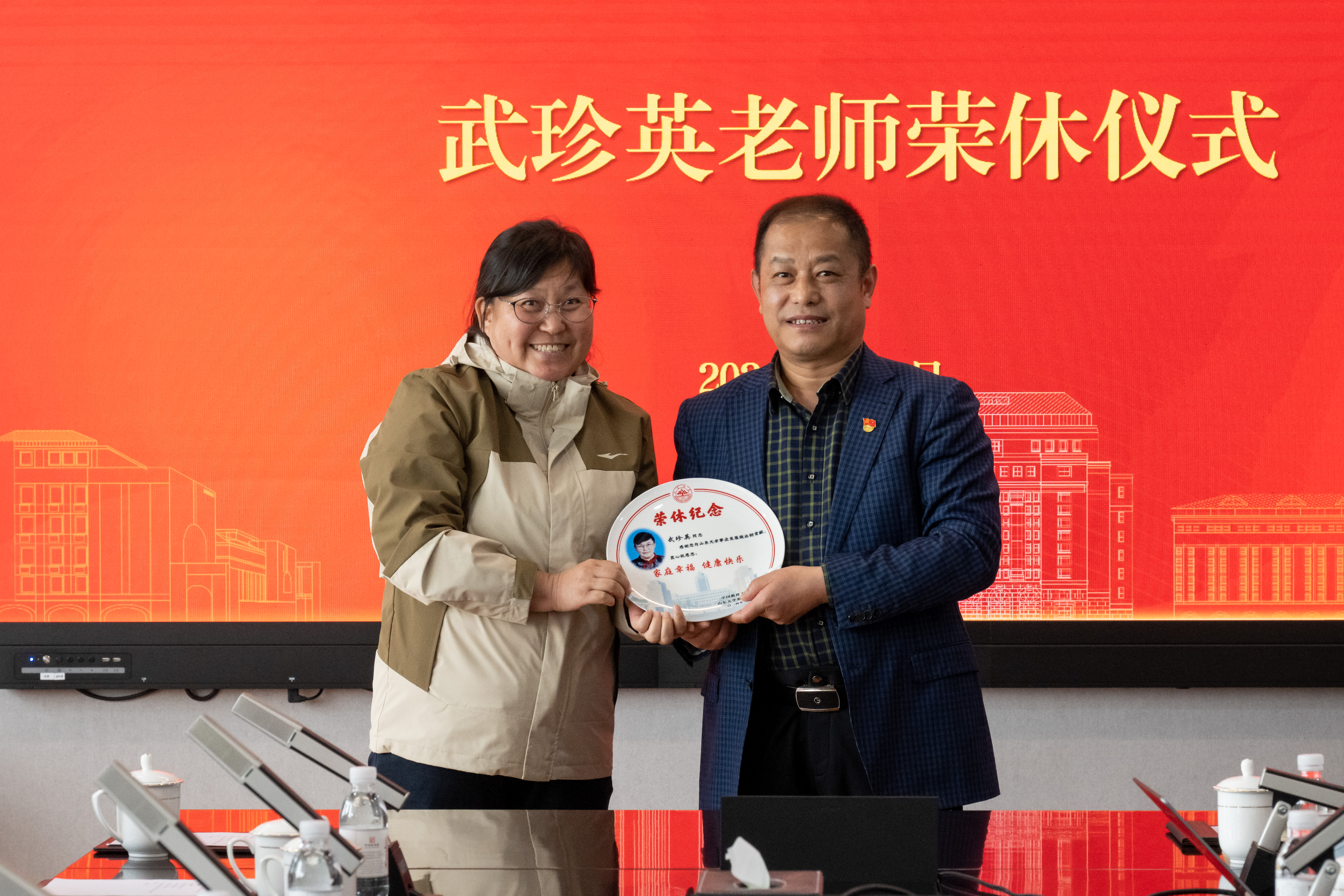 随后,王宪华和副院长胡思煌为武珍英老师献上了鲜花和荣休纪念盘。