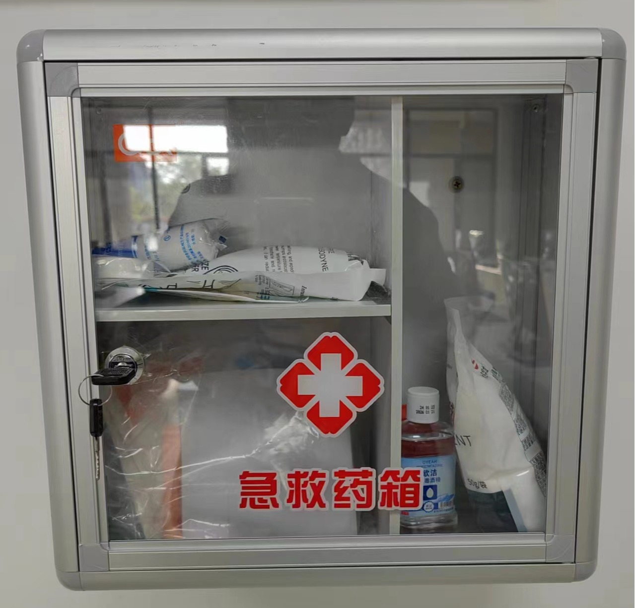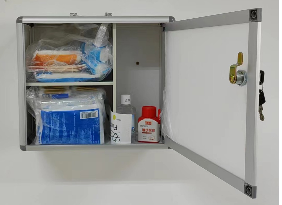 目前,安全隐患已完成整改。灭火器方面,负责人已联系保卫处同事进行了及时更换;应急药品方面,学院采购了碘酒棉球、酒精、脱脂棉棒、一次性医用手套、瞬冷冰袋等物品,还增配了统一的壁挂式应急物品药箱,悬挂于墙面显眼处,方便有需要的师生尽快拿取。