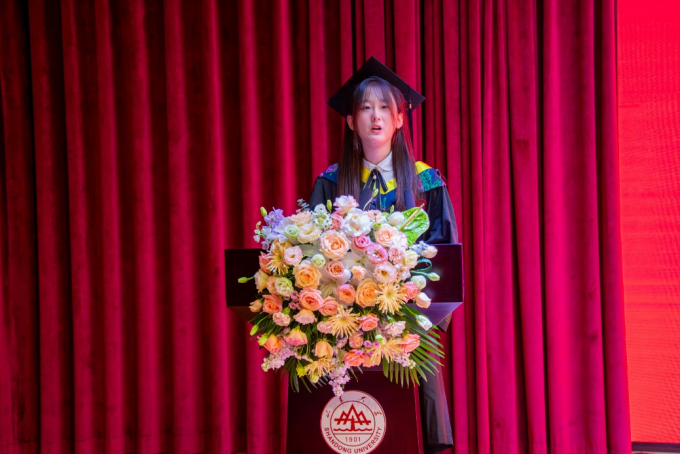 研究生毕业生代表涂彬彬和本科毕业生代表时梦雅表达了对学院和老师的感激之情,表示将带着山大人的勇气和责任感,投身于新时代的舞台,为实现中华民族的伟大复兴而奋斗,用青春、智慧和力量做出贡献。