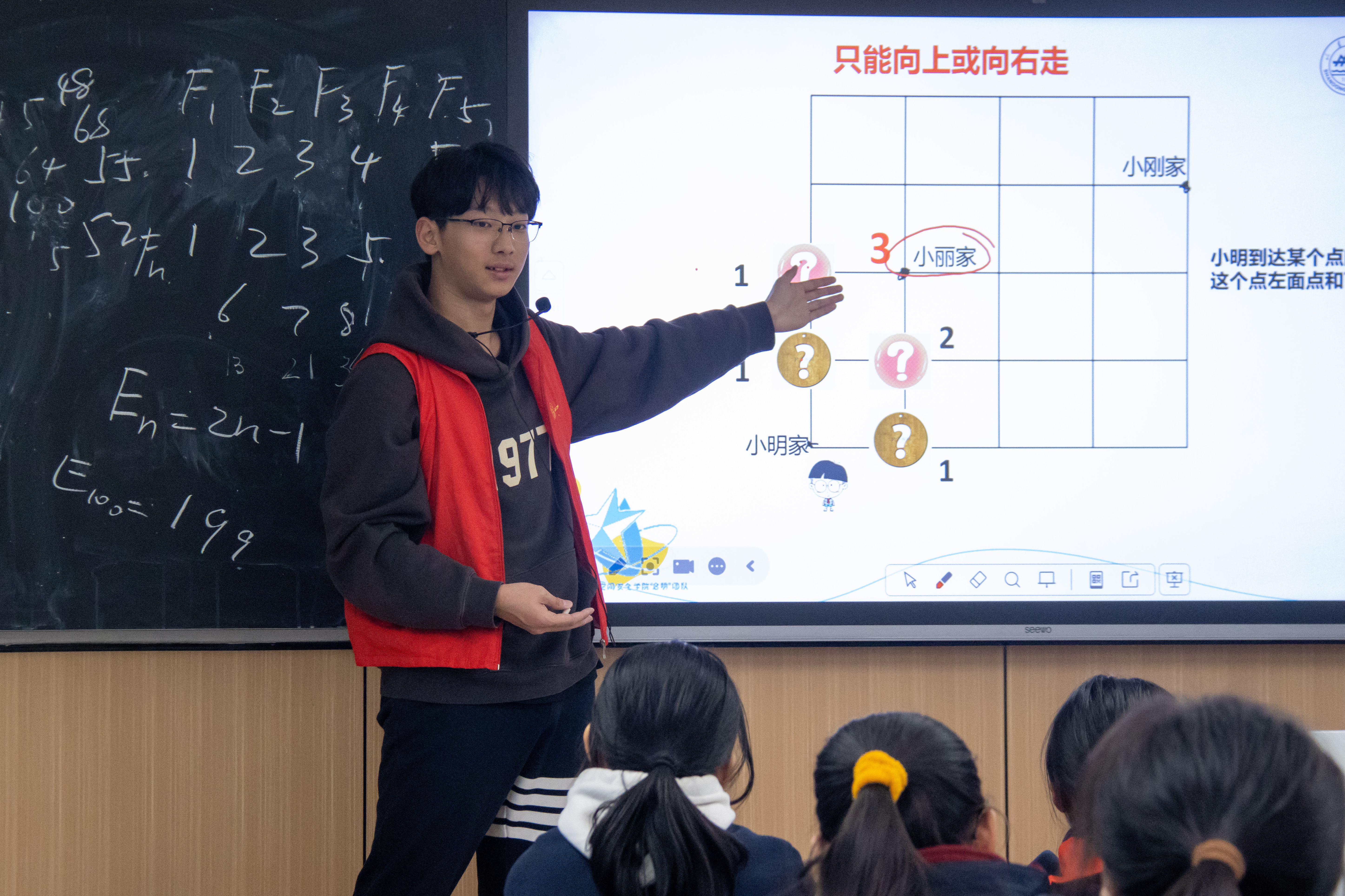 活动讲师均由2024级新生志愿者担任,这也是他们第一次将自己设计的两门全新课程带入启明科普课堂。《什么是递推》《信息储存》两门全新科普课程分别为数学、计算机方向。其中,《什么是递推》以数学中的递推思想为主题,通过日常生活中的问题入手,带领小朋友们对递推进行初步的认识,了解递推思想在数学中的应用,在计算机科学中的应用。《信息储存》递进深入,对于计算机二进制数的介绍并进行简单的加法运算教学,让小朋友们对计算机的最基础的运行方式有大致的认识,为之后初高中的进制拓展的具体学习建立基础。