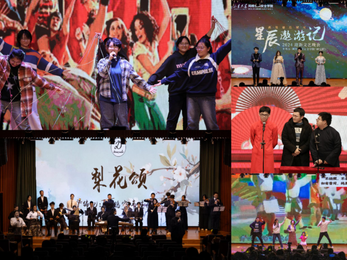 颁奖典礼后,迎新晚会正式开始。节目包含了舞蹈、弹唱、歌剧、相声等多种表演形式,为观众呈现了一场视听盛宴。此外,魏英凯、解逸群等全体辅导员老师也带来《苹果香》、《APT》等节目,得到现场师生们的热烈响应。整场晚会气氛热烈,同学们积极参与互动,充分展示了学院师生的青春活力和艺术风采。