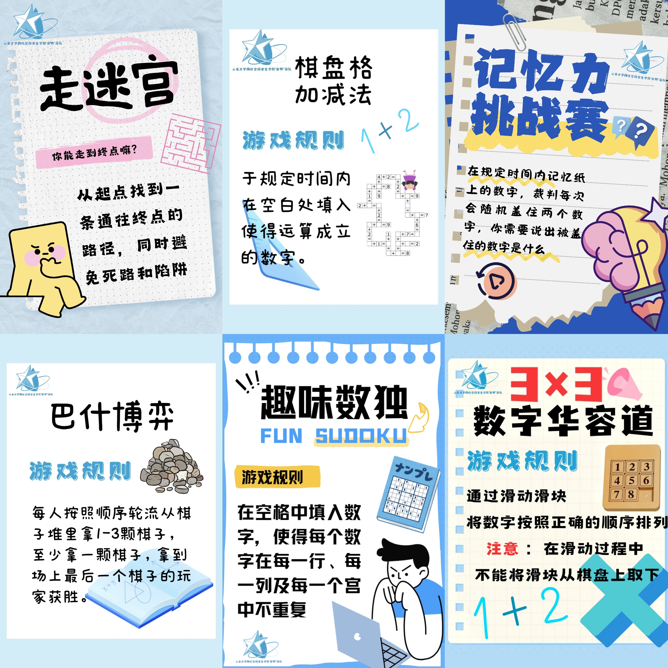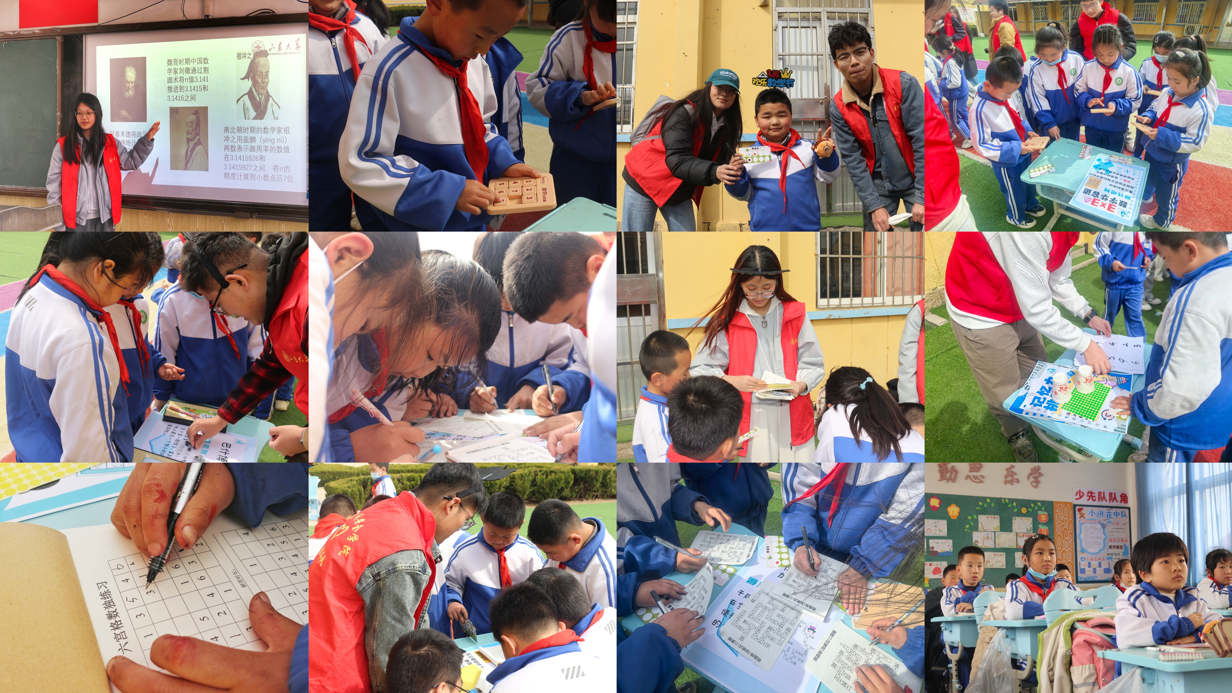 在场元小学,精心准备的π Day游园会收获了小朋友们满满的尖叫。在志愿者的精心组织下,小朋友们5人一组,在数字华容道、巴什博奕、棋盘格加减法、记忆力挑战赛、趣味数独、迷宫等数学摊位上集思广益,碰撞出智慧火花。