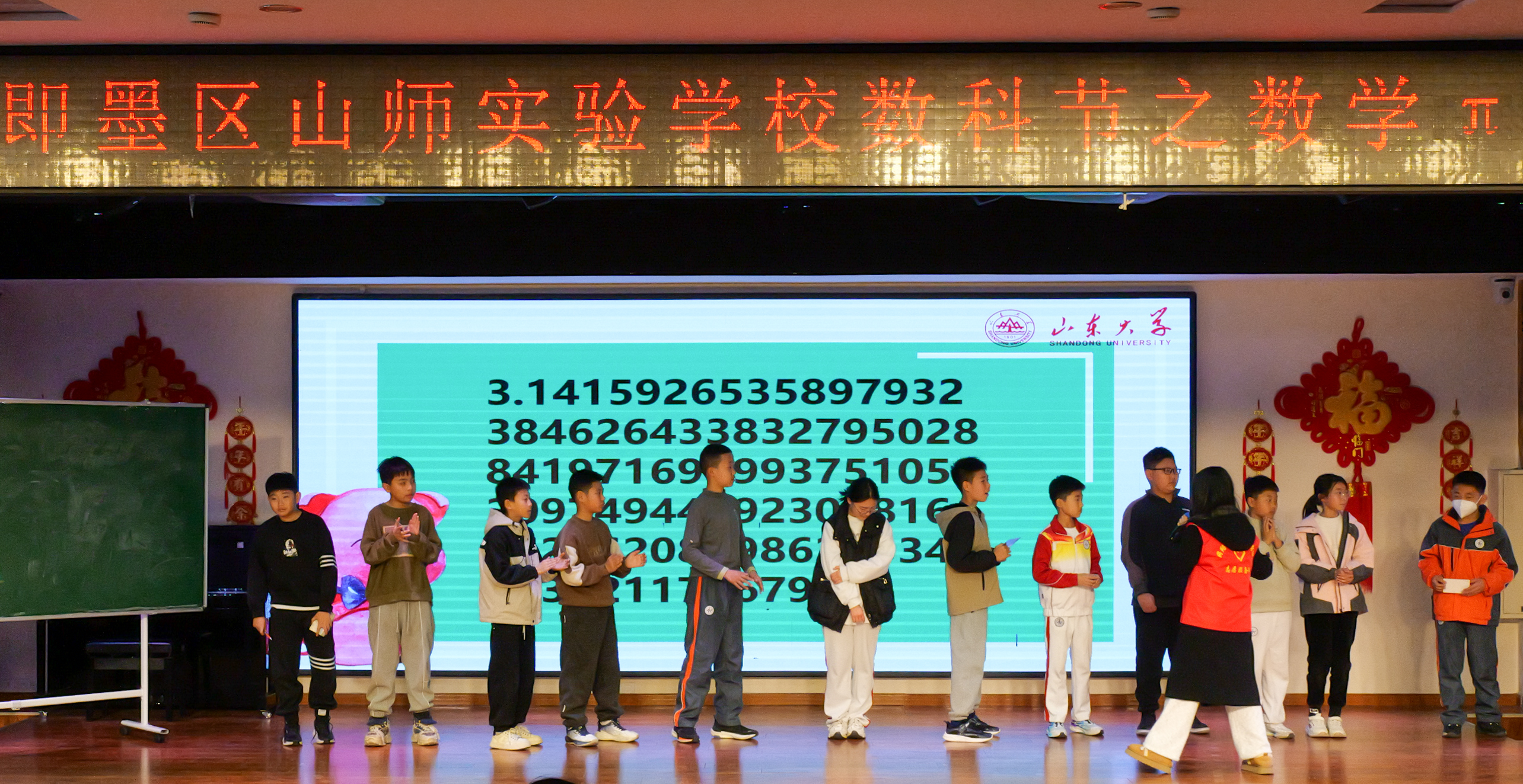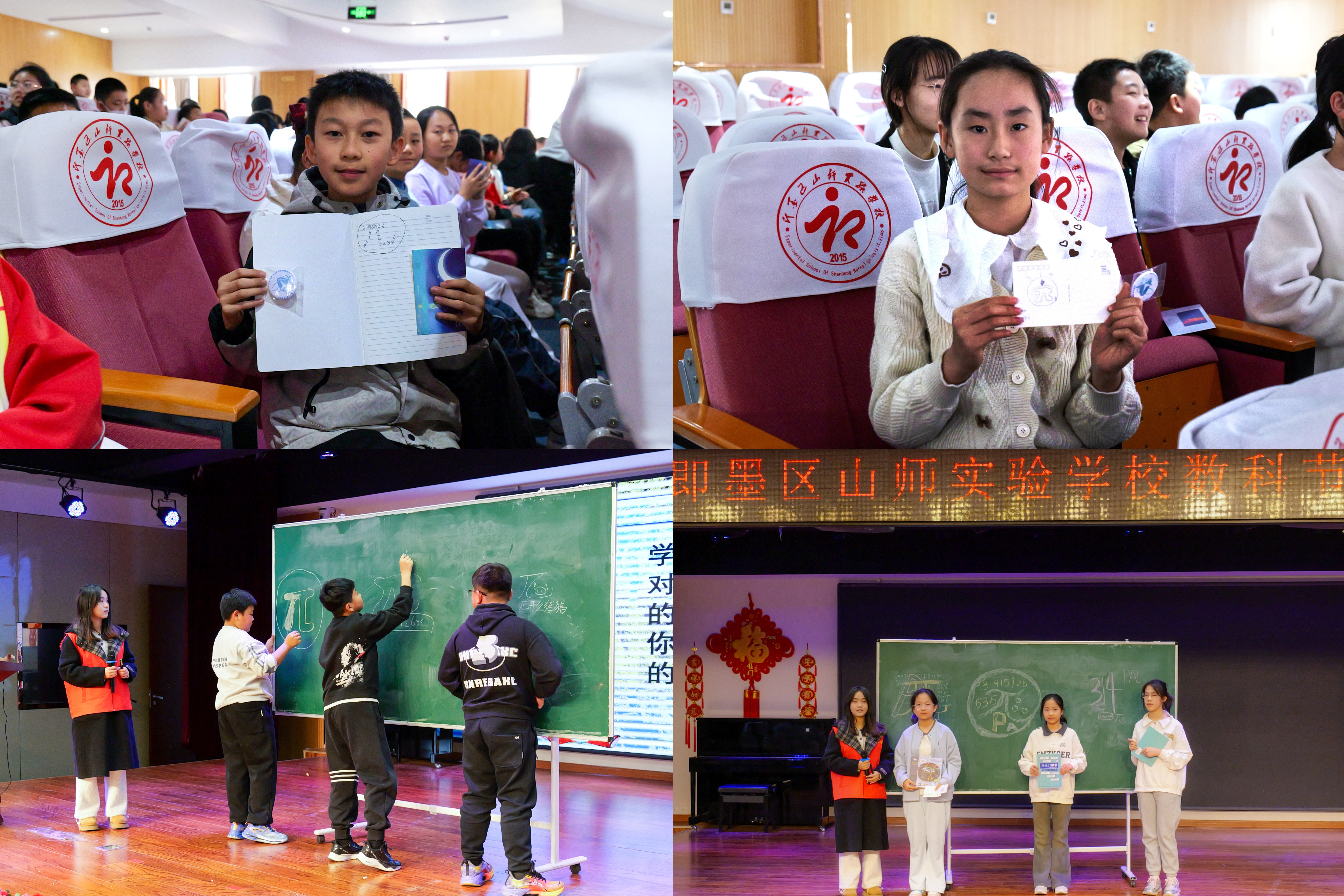 在青岛市即墨区山师实验学校,“π Day探险队,寻找圆的秘密”专题科普活动也如火如荼地进行。志愿者从生活中的例子入手,着重介绍了中国古代神奇的“割圆术”以及数学家祖冲之与圆周率的故事,不同的圆周率计算方法,以及圆周率在不同场景下的应用。而后,从《少年派的奇幻漂流》入手,引导小朋友们进行了一场“谁是记忆大师”的游戏。参赛者需在规定时间内默写圆周率,按位数排列名次,最终获胜的小朋友背诵至圆周率31位,获全场热烈掌声。志愿者还带领小朋友们利用所学图形设计π Day主题logo,丰富的设计与想象中蕴含了小朋友们的满满收获。