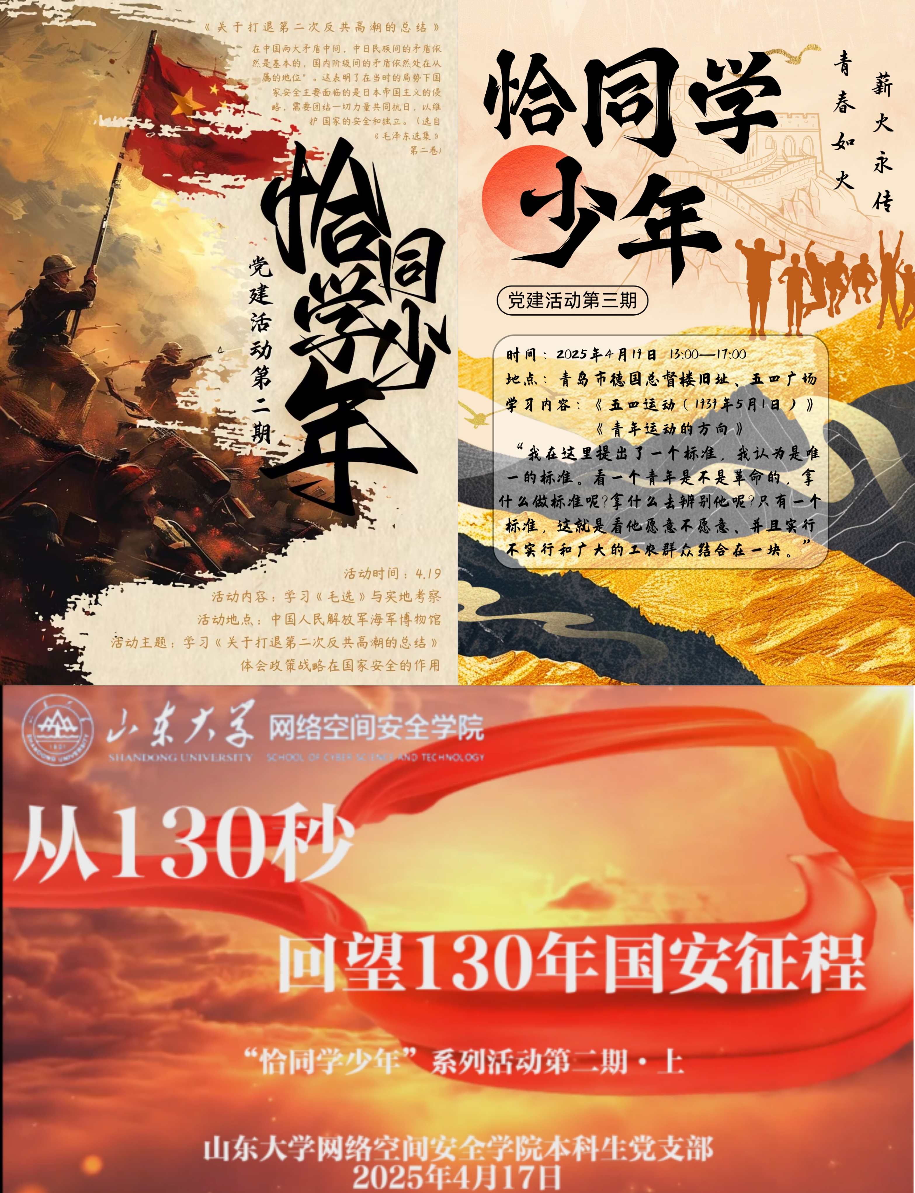 从历史中学。以“回望甲午海战,关注国家安全”为主题,组织师生党员开展“恰同学少年”主题活动,赴青岛市海军博物馆、德国总督楼读毛选学四史,制作《130秒看130年:从甲午之耻到威定海疆》主题视频,以“沉浸式军事历史教育”强化国家安全观。