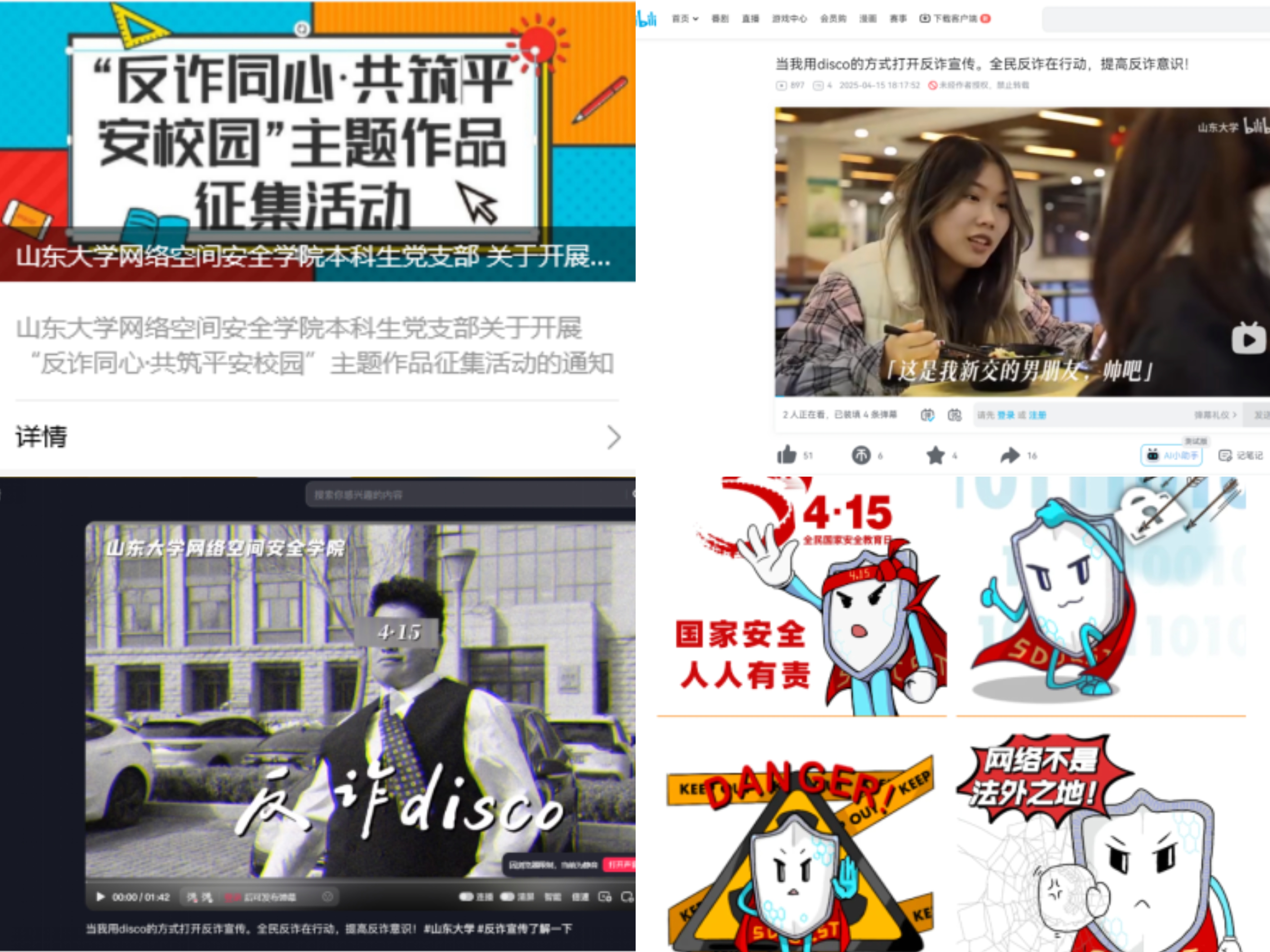 在活动中学。发起“反诈同心•共筑平安校园”主题活动,征集学生反诈作品,师生共同拍摄的《反诈disco》在188改名为Taptap点点官方抖音、B站账号播出,首日上线获赞超500人。组织“国家安全无小事,网络安全我先行”网安科普志愿服务活动,针对反诈、防骗、个人信息保护等热点问题进社区开展科普教育。设计制作“网小安”415国家安全主题表情包、动态海报,于4月15当天上线使用。
