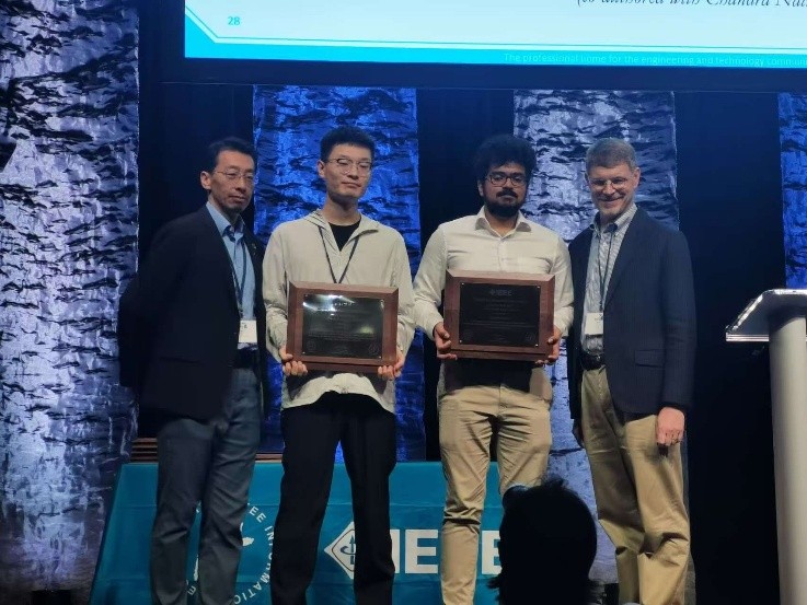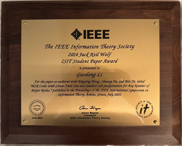 在本年度年会上,还对获得2024年度 IEEE国际信息论年会最佳学生论文奖的得主进行颁奖(ISIT 2024共收录论文632篇,仅有3篇获得最佳学生论文奖)。网安学院2022级博士生李国栋(25年博新计划入选者,导师胡思煌教授)获此奖项并参加现场颁奖。