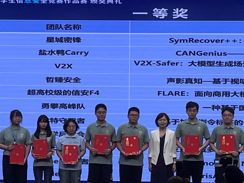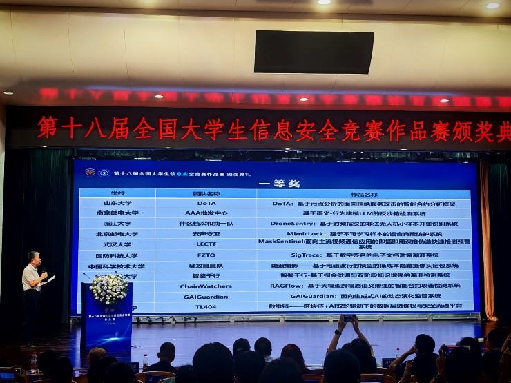 经过激烈角逐,由程斌林副教授指导的DoTA团队作品《DoTA:基于污点分析的面向拒绝服务攻击的智能合约分析框架》(队长:高鹏鸿,队员:侯佳玺、赖宇帆、密语)获全国一等奖。由刁文瑞教授指导的东里四小只团队作品《大语言模型驱动的移动应用密码技术安全审计系统》(队长:高雅琦,队员:刘功冠、秦川、米文熙)、由魏普文教授指导的早八起不来队团队作品《后量子投票系统》(队长:魏欣悦,队员:王奕文、李瑞佳、姜良萍)获全国二等奖。由郭山清教授指导的洞见青蓝队作品《青蓝洞见:师生协同的污点模式学习与引导式智能漏洞挖掘系统》(队长:陈万里,队员:马旭恩、王子兴、单怡颖)、李政教授指导的晚安玛卡巴卡团队作品《基于AI Agent和LLM的自动化漏洞修复系统》(队长:高钲超,队员:吴扬、鲍泓睿、由锦函)、邓子壮副研究员指导的老谢野混沌团队作品《VoiceGuard——多模型韵律保持语音防护系统》(队长:岳乔熹,队员:孙文佳、蔡中仪、张弛)获全国三等奖。