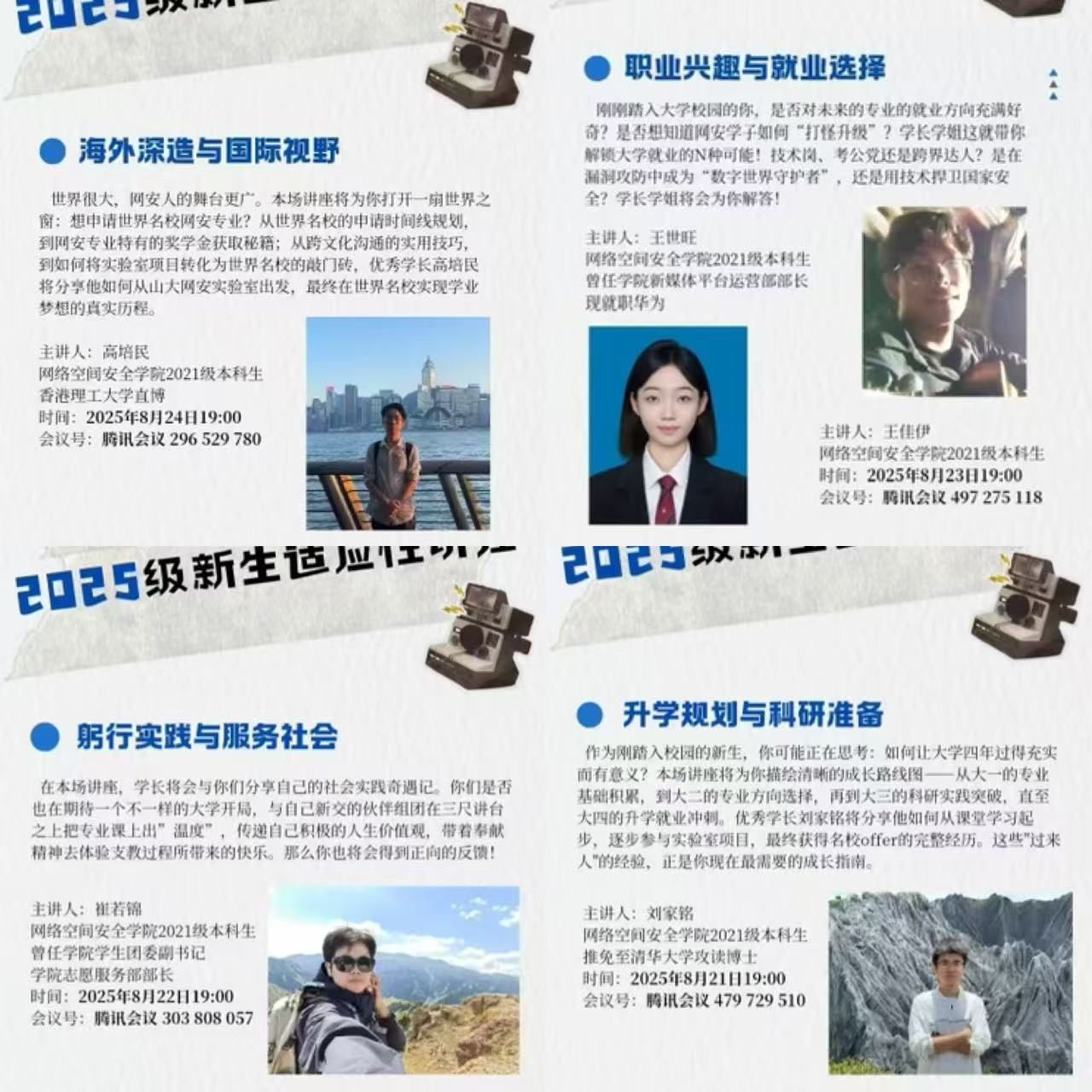 迎新生,拉开全面成长帷幕。为助力新生更好适应大学生活、规划未来,学院精心筹备了主题为“乐学讲堂・网安启航”的新生适应性讲座,从升学规划、实践服务、职业选择、海外深造等多个维度开展入学教育。同时,学院高度重视新生爱国主题教育,积极开展纪念中国人民抗日战争暨世界反法西斯战争胜利80周年的“光影抗战”电影推荐活动,为传承崇高民族气节和伟大红色精神凝神聚力。
