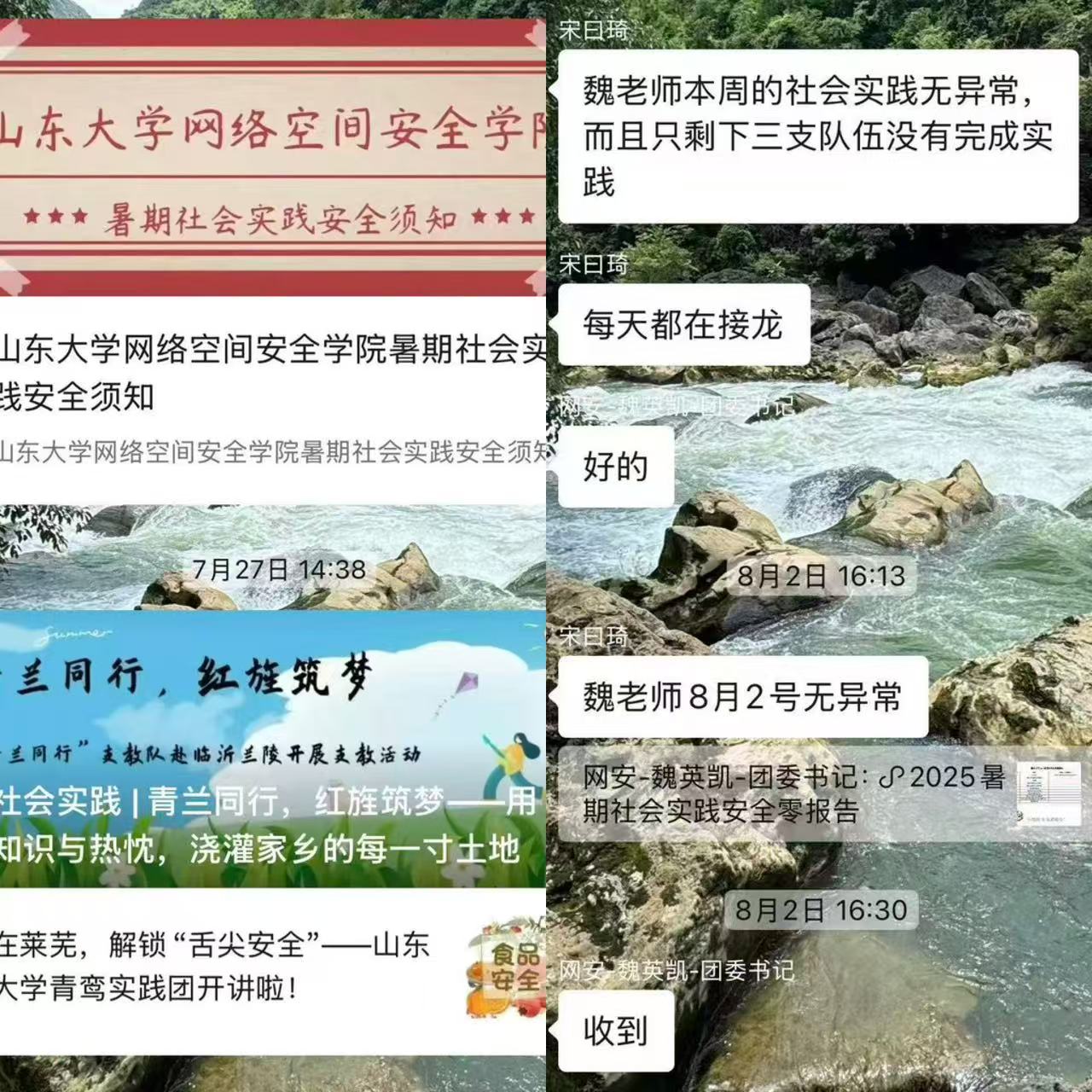 践使命,书写青春担当答卷。学院暑期社会实践活动涵盖青鸟计划、支教助学、红色调研等板块,多点开花,10余支实践队伍分赴各地开展多样化服务。既有“百里乌孙”等实践团分赴新疆伊犁、内蒙古乌兰察布等地,调研民族文化符号,传递网安理念;又有“沭光启航”“网安筑梦”等支教团在临沭、梁山、沂南、卫辉等地开展支教活动;还有“追光科普队”等科普团队在社区开展网络安全科普宣讲,拉近居民与网安的距离。学院还开展了参观禹城市革命纪念馆爱国活动,旨在让学生近距离接触红色文化,坚定理想信念,传承红色基因。