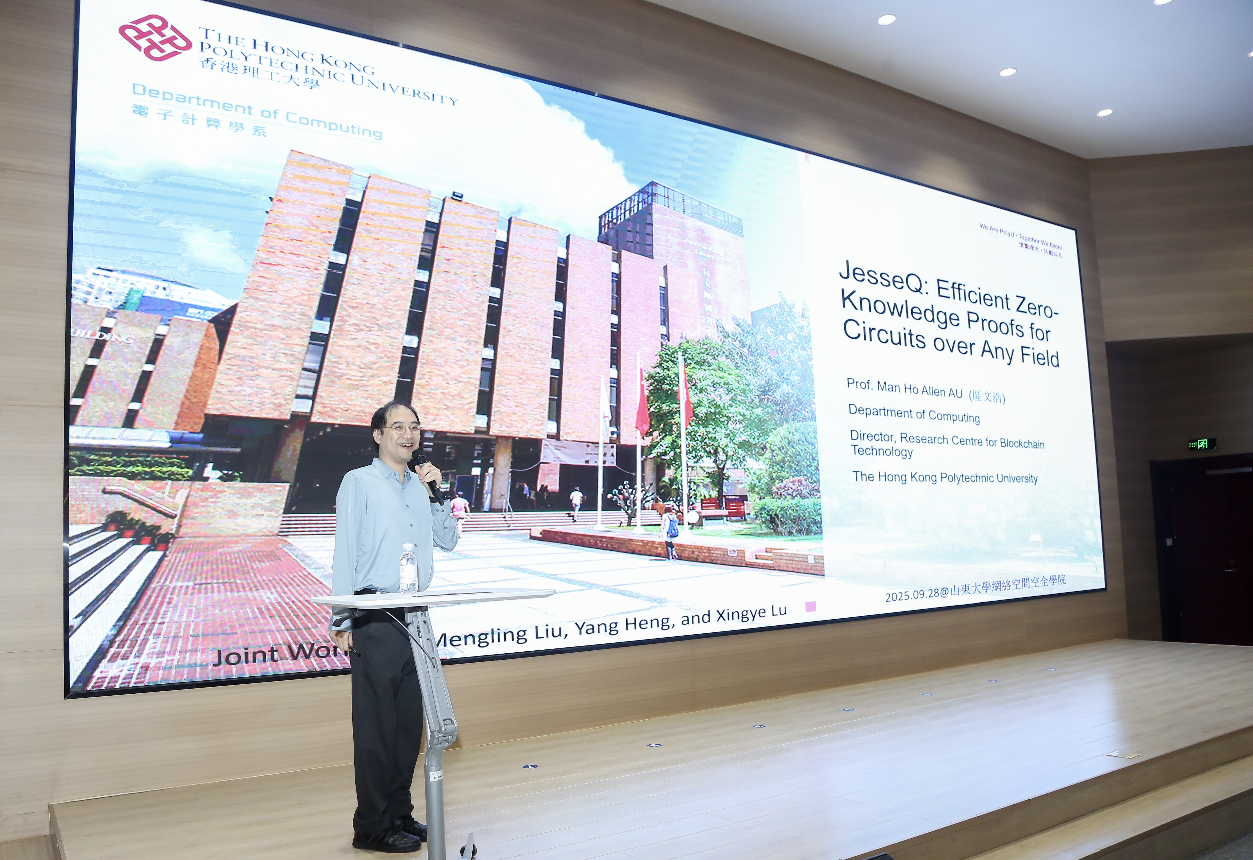 Prof. Au presented a lecture titled "Efficient Zero-Knowledge Proofs for Circuits over Any Field", introducing their latest zero-knowledge proof system built on Vector Oblivious Linear Evaluation (VOLE). JesseQ supports both arithmetic and Boolean circuits over any field and achieves high performance with minimal overhead. He further discussed the practical applications of VOLE-based proofs in real-world scenarios such as verifiable computation, and private authentication. Attendees, including faculty and students, engaged in discussions with Professor Au on topics such as protocol construction techniques, distributed acceleration of zero-knowledge proofs and their applications.